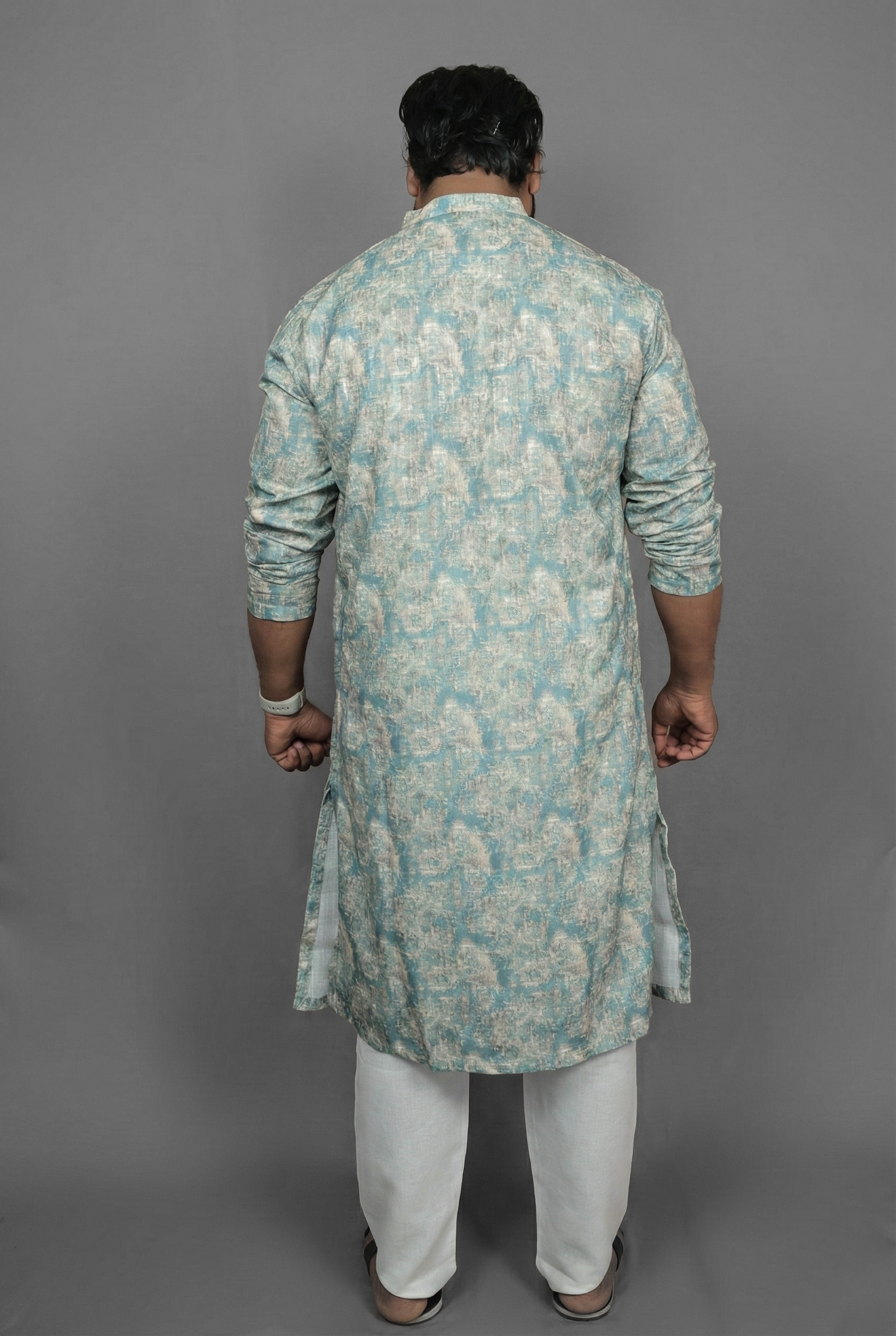 Discover the Antique Watercolor Blue Kurta, a garment embodying sophisticated elegance and comfort. This long kurta combines artistic watercolor aesthetics with practical design, an exemplary addition to any refined wardrobe.