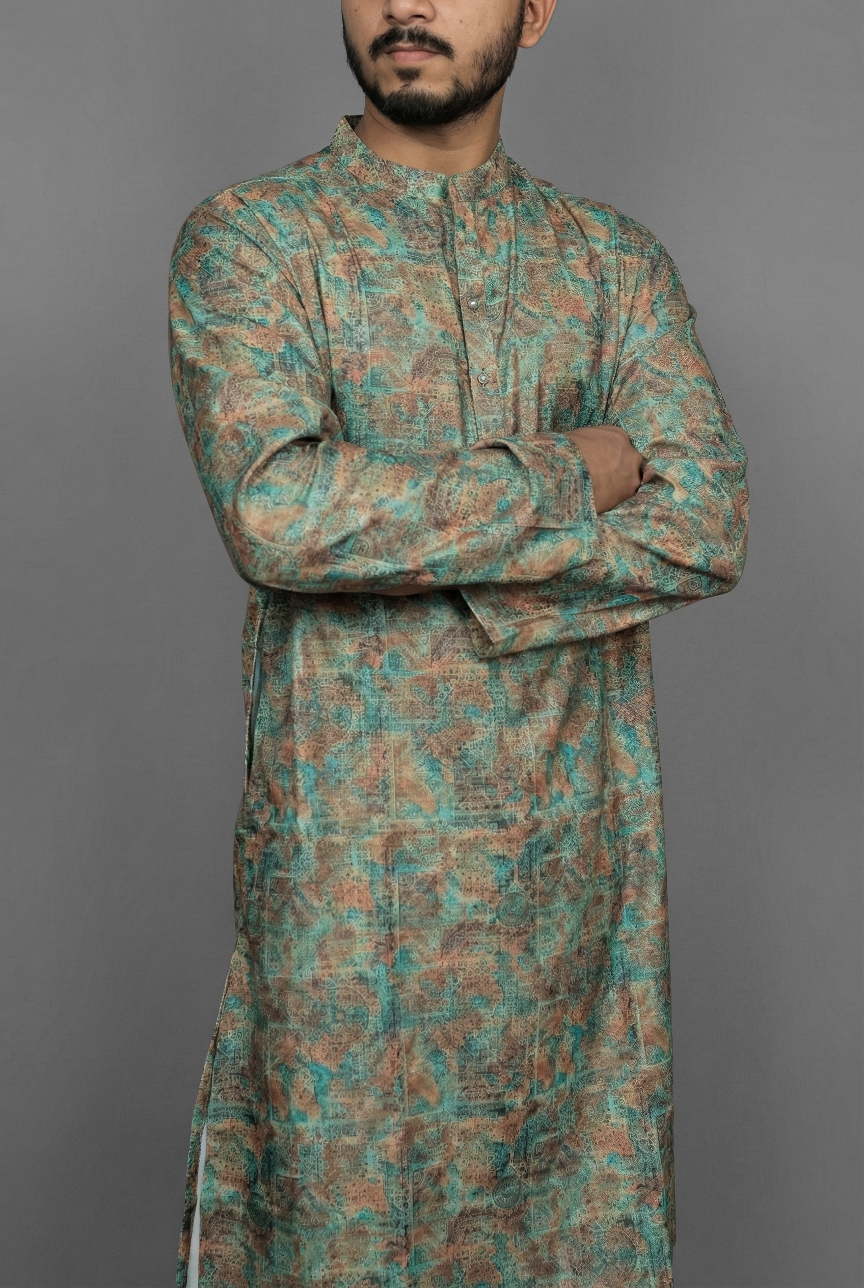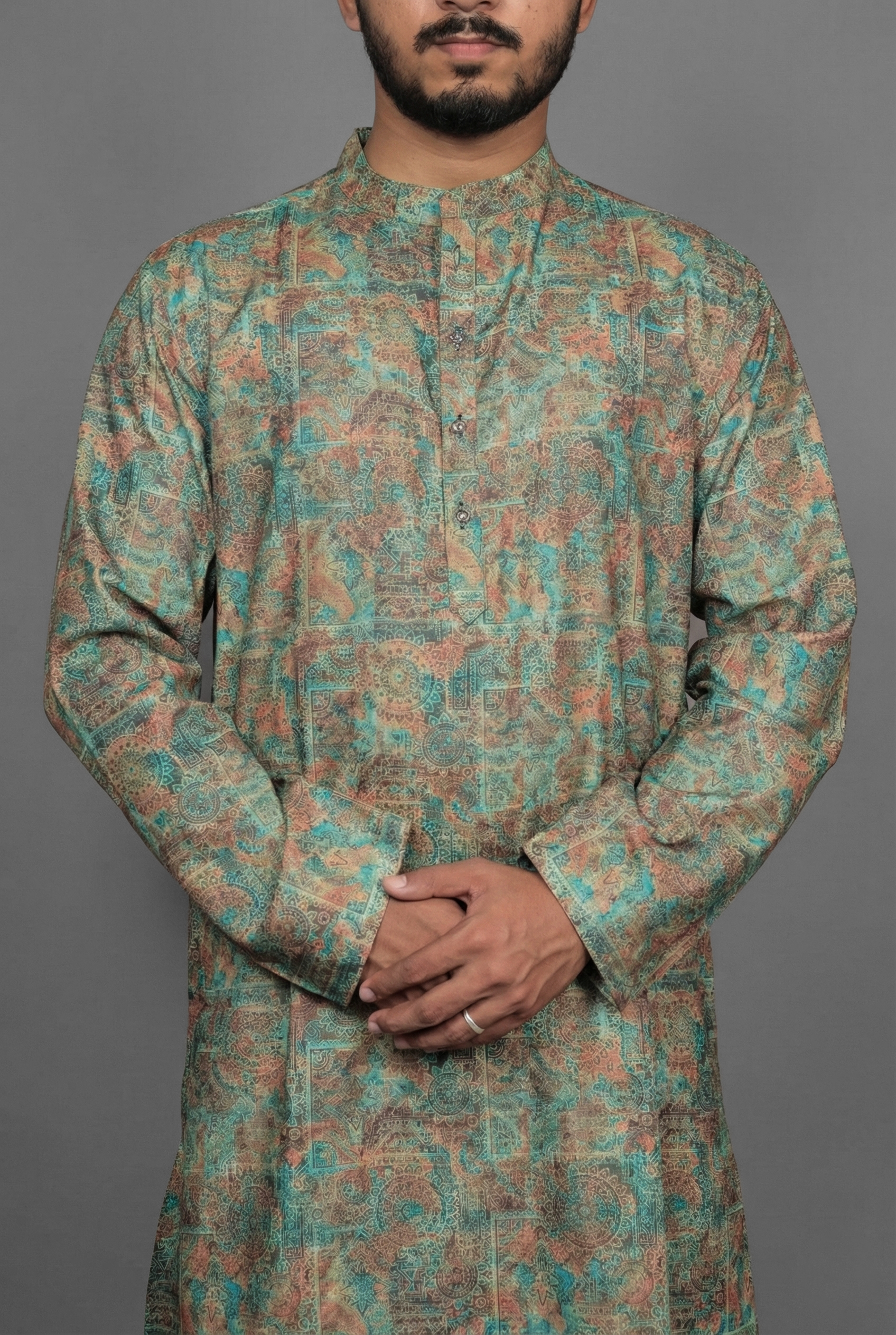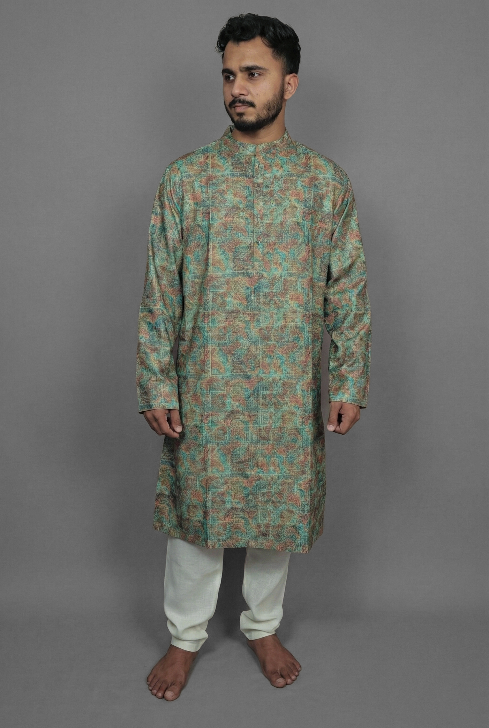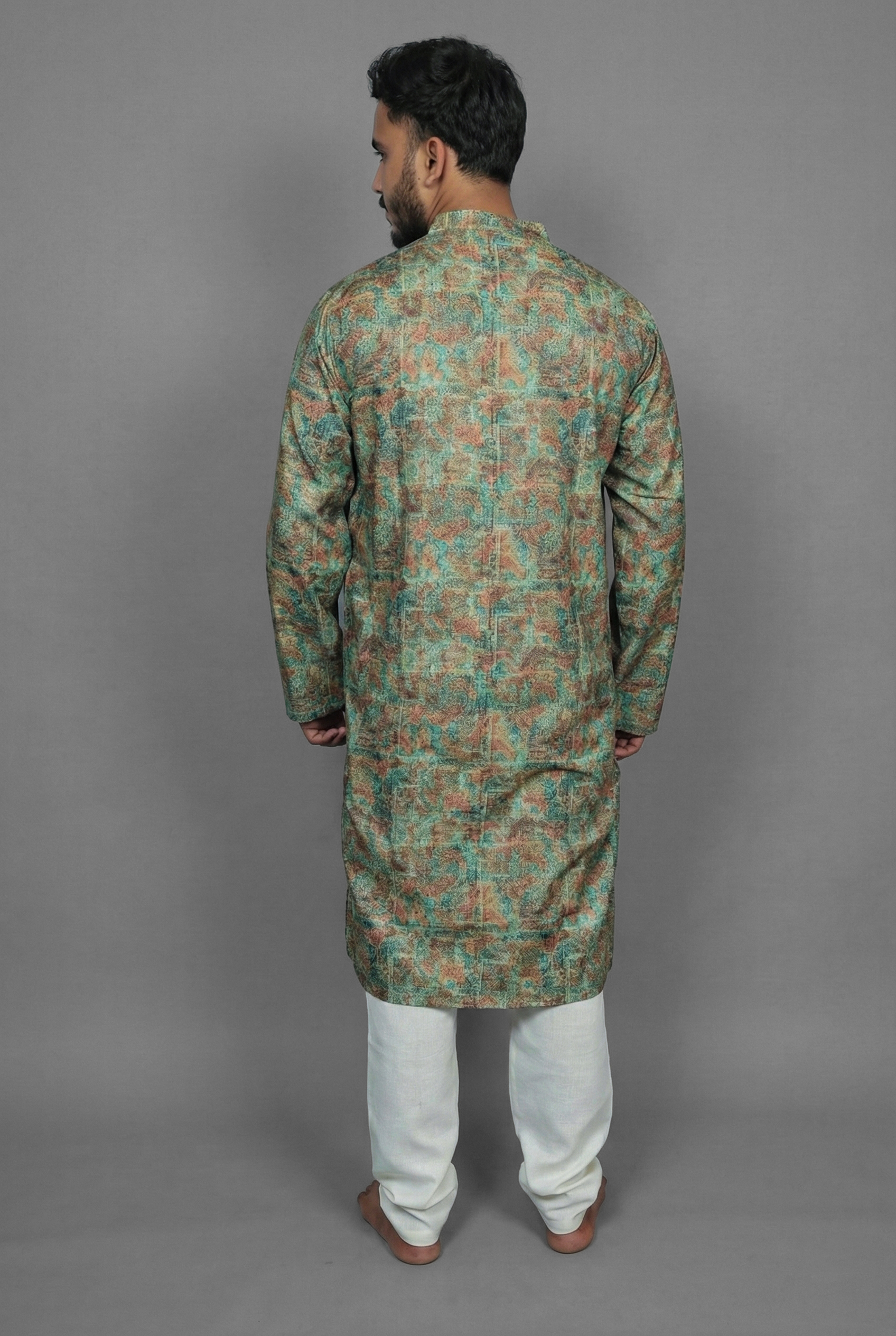 Connect with a more grounded sense of style with the Earthy Tile Green Kurta by Sajraah. This design combines the soothing appeal of natural green tones with the structured beauty of a classic tile motif. The result is a garment that feels rustic yet refined, perfect for the man who appreciates a look that is balanced and composed. The geometric pattern adds visual interest without overpowering the calming color, making it a versatile piece for family gatherings, office Fridays, or cultural events.