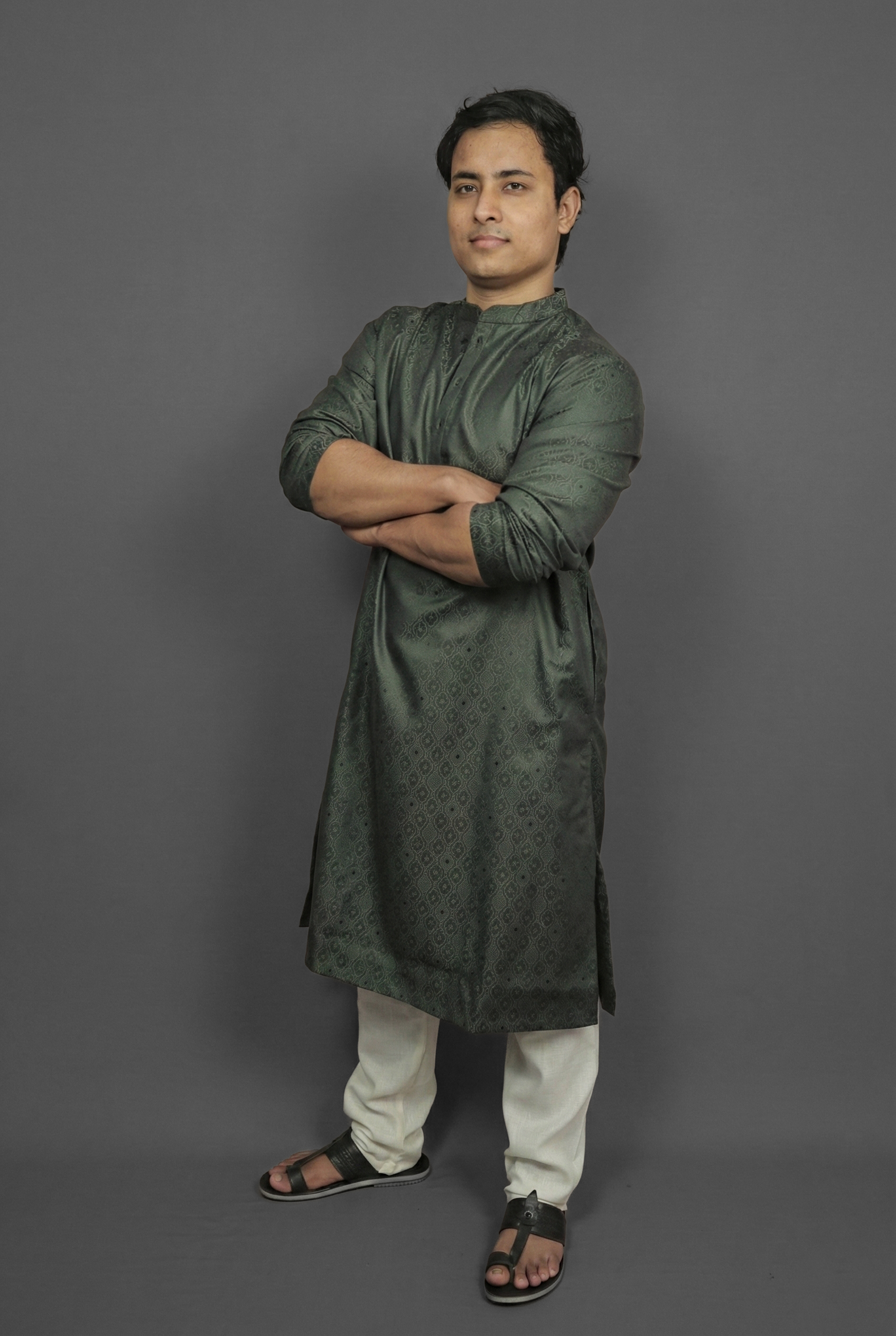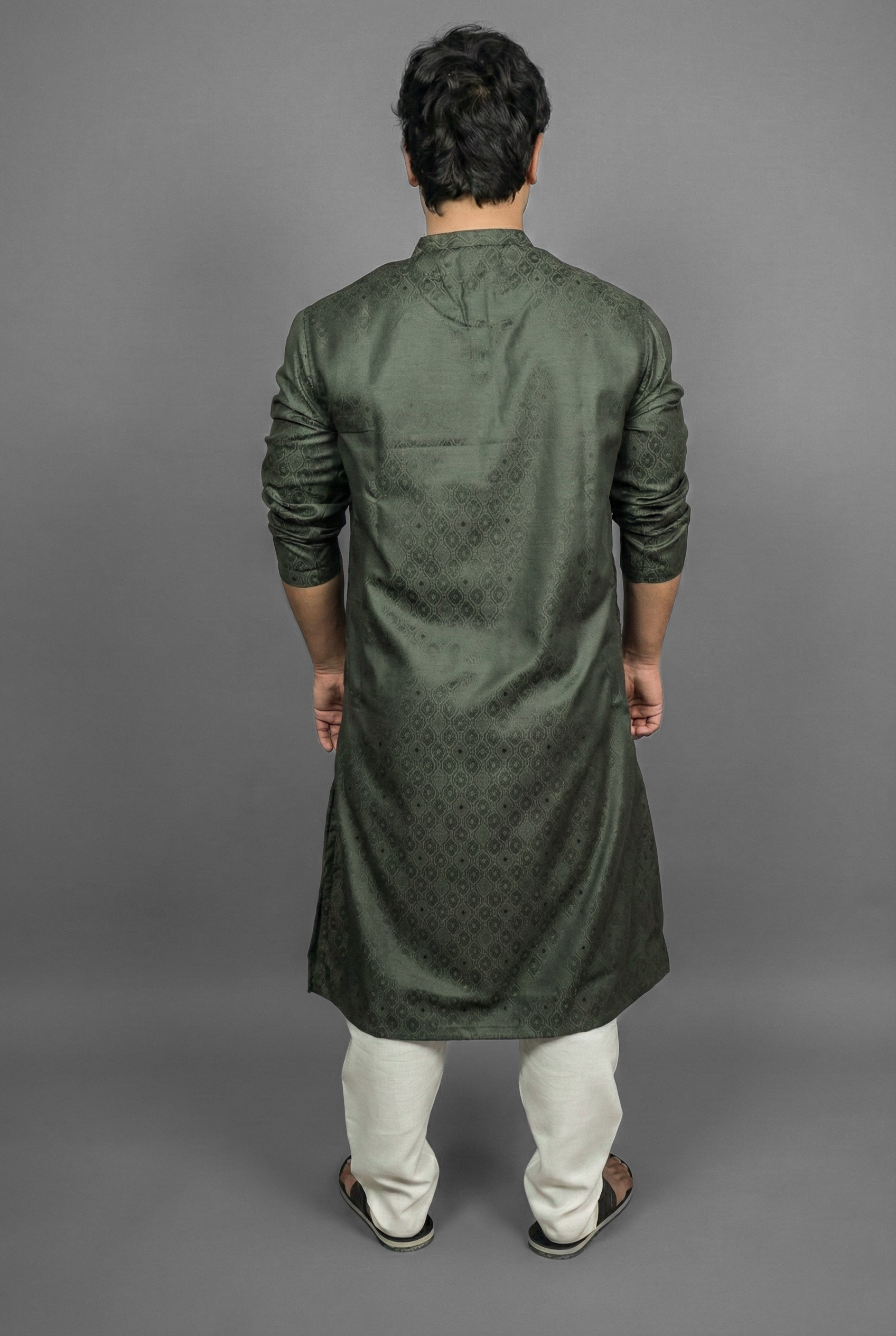 Blend into the beauty of nature with the Forest Olive Green Kurta by Sajraah. This “Forest” olive shade is deep, muted, and incredibly masculine. It offers a sophisticated alternative to bright greens, providing a look that is grounded and mature. Ideal for evening wear or winter gatherings, this kurta pairs exceptionally well with beige or mustard accessories, offering a look that is understated yet distinctive.