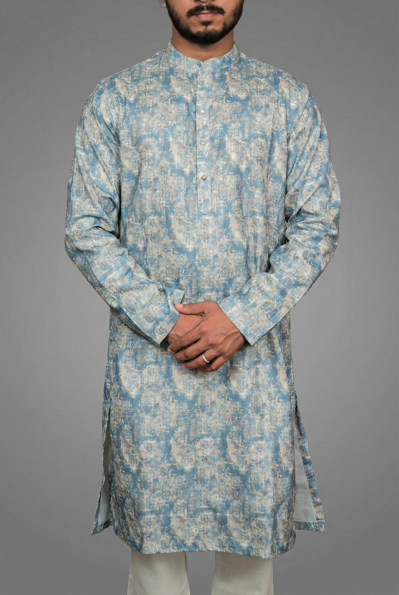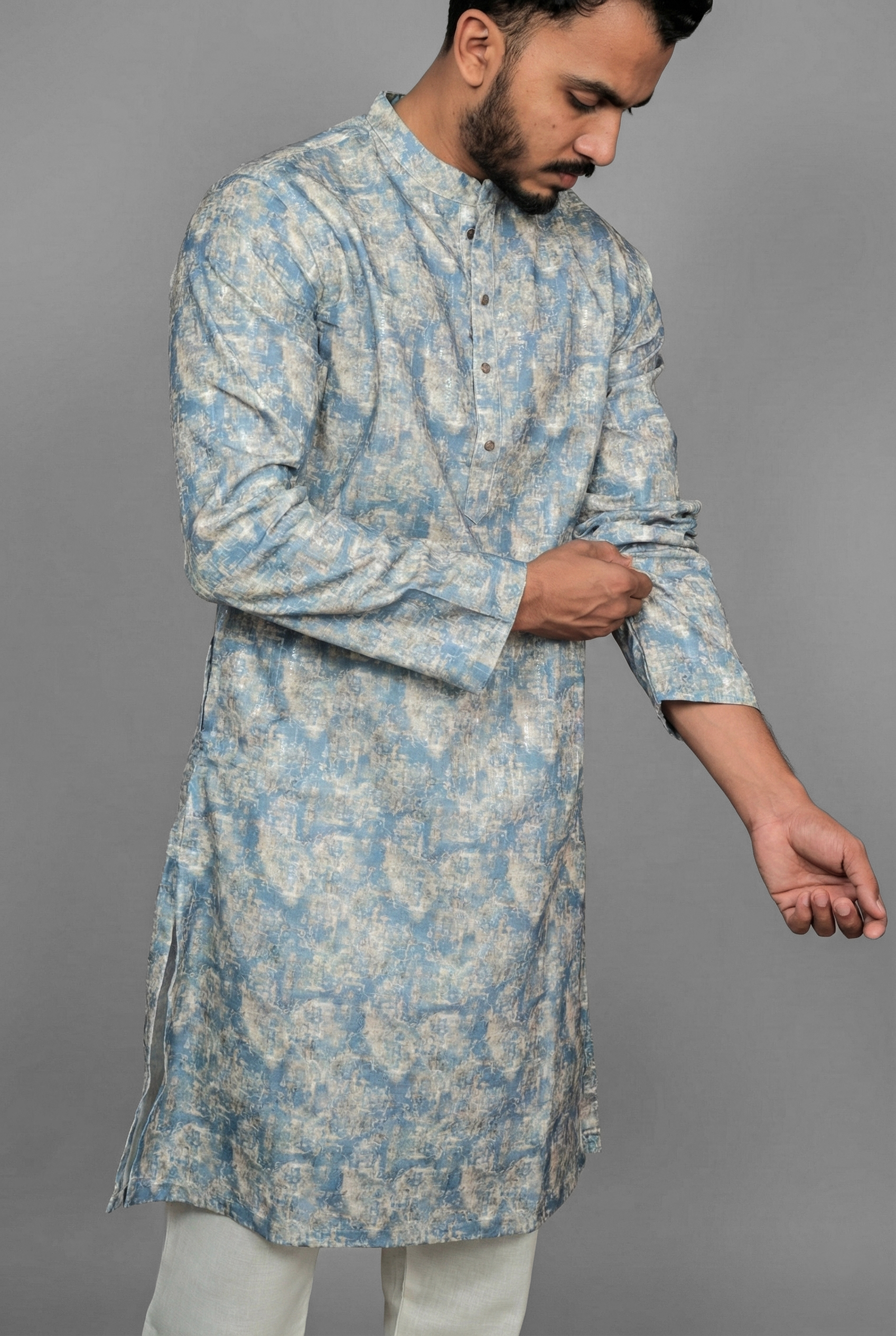 Immerse yourself in the deep sophistication of the Indigo Fuvim Blue Kurta by Sajraah. This piece celebrates the enduring popularity of indigo blue, a shade that symbolizes depth and confidence. The “Fuvim” design adds a unique character to the fabric, offering a visual appeal that moves beyond simple solids without being overwhelming. It is the perfect blend of tradition and modernity, tailored for the man who wants a versatile kurta that transitions effortlessly from office wear to evening gatherings.