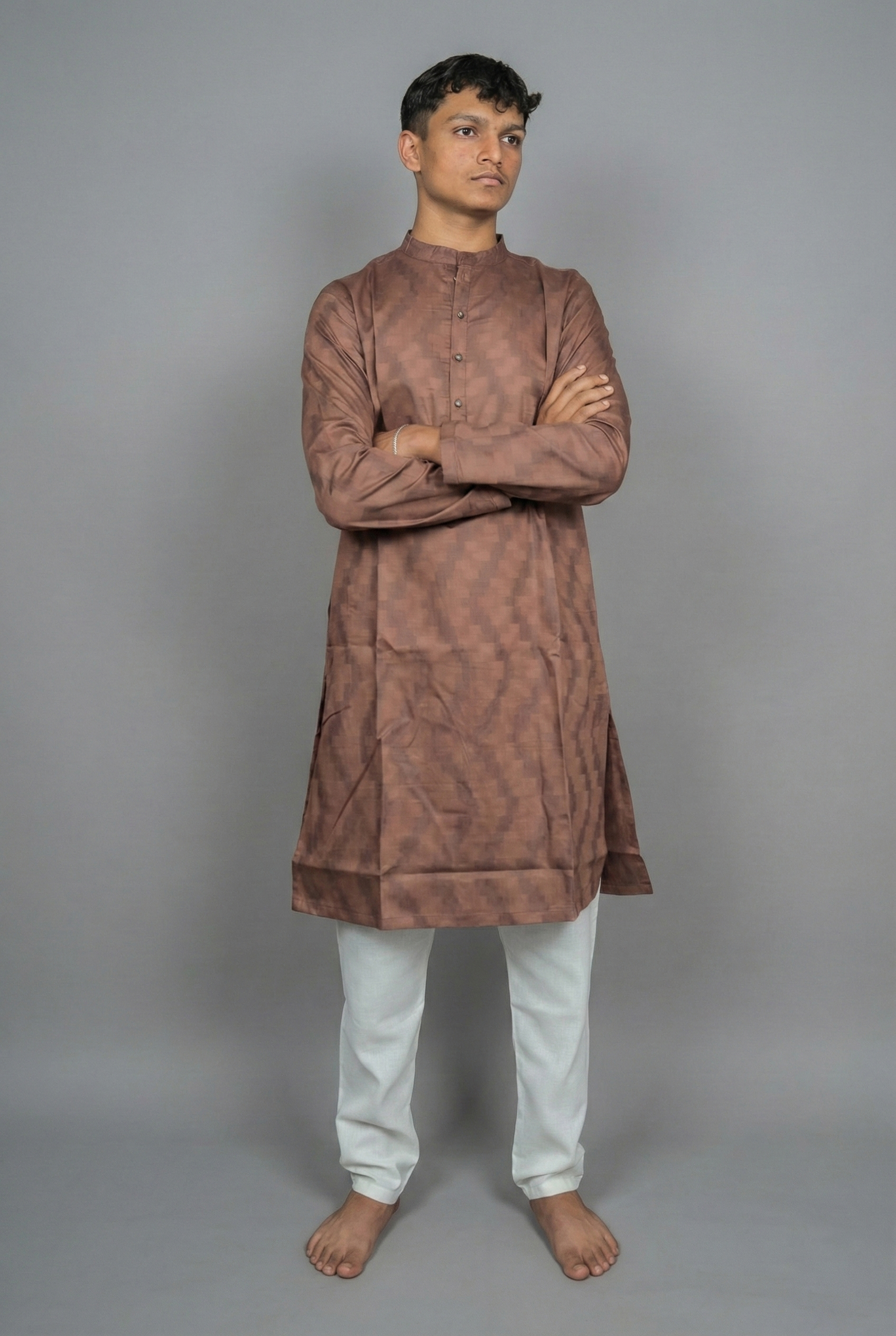Ground your style in the warmth of the Sienna Earth Brown Kurta by Sajraah. Inspired by the artistic pigment of burnt sienna, this kurta offers a unique reddish-brown hue that is both rustic and refined. It stands out from standard browns, offering a color that feels warm and inviting. Ideal for daytime gatherings or autumn festivals, it pairs wonderfully with cream or beige bottoms.